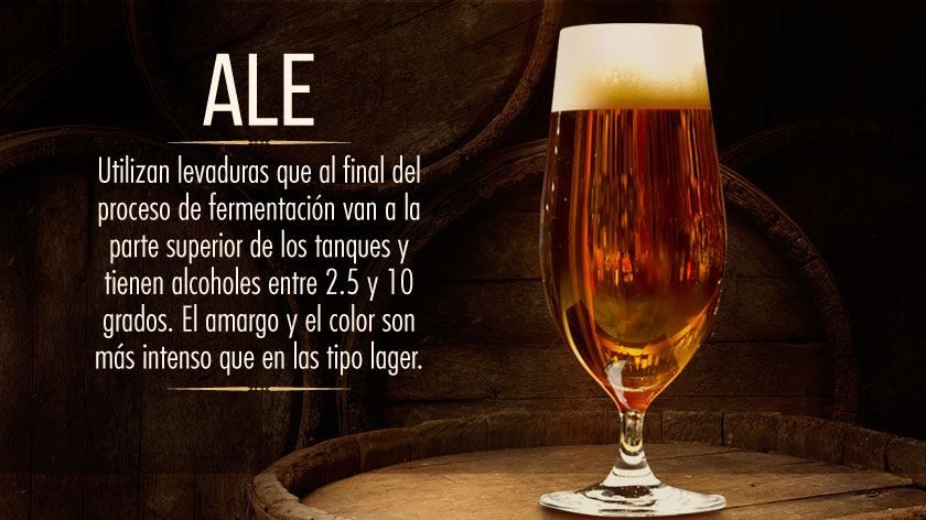 El término ale se refiere al tipo de fermentación y no tiene nada que ver con el color, estilo o cuerpo. Las ale pueden ser pálidas u oscuras , tener mucho o poco cuerpo, alta o baja graduación alcohólica y ser más o menos amargas. Todo dependerá, entre otras cosas, de la cantidad y tipo de malta que se utilice, del lúpulo y de la maduración que experimente.